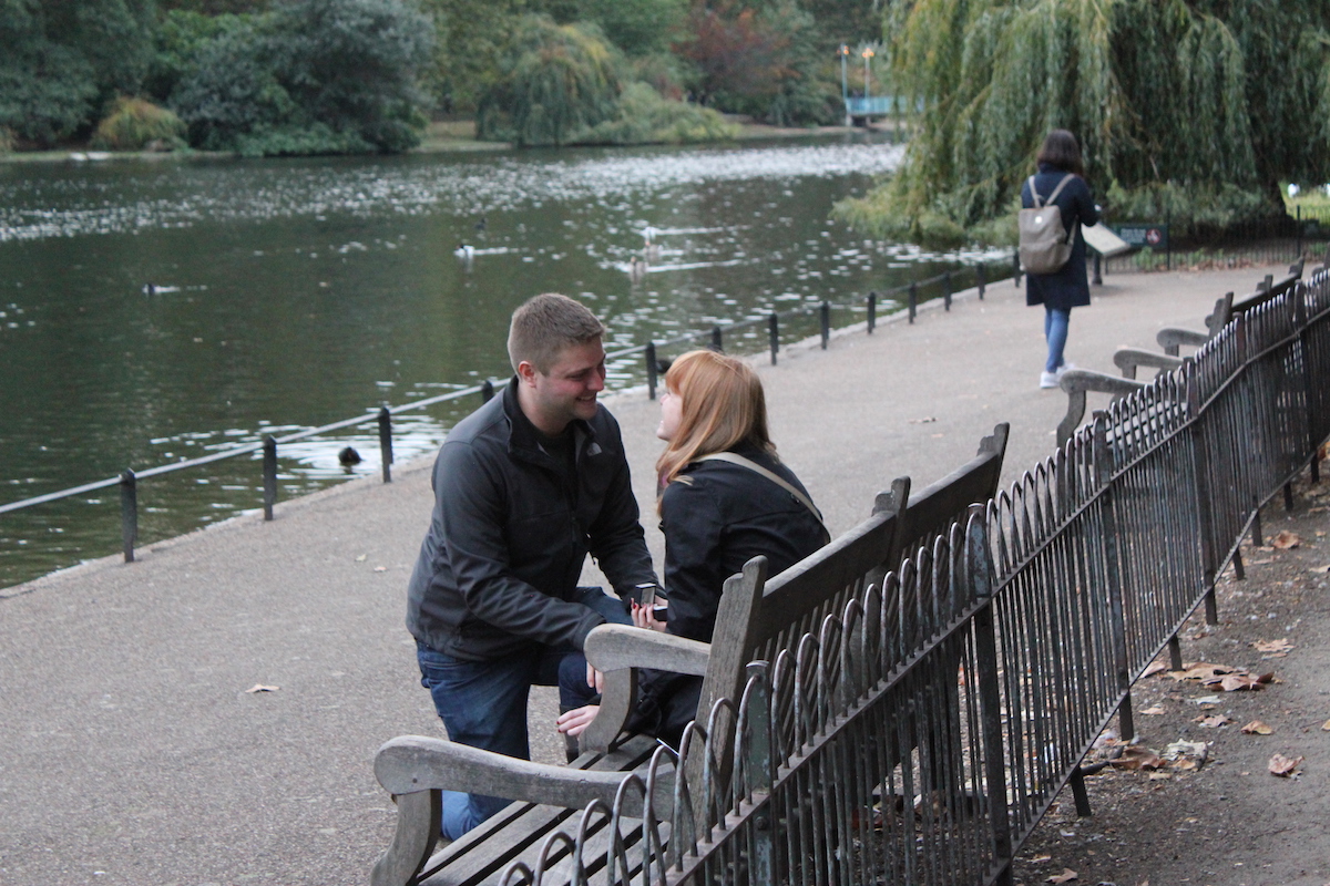 Her Story: I love London and I couldn’t wait to show Pat the city. My parents needed to be in town for work, so we combined trips! As all of us were walking back from dinner the night before, my dad asks us “Want to have wine and cheese in the park tomorrow?” I immediately respond with a quick yes, because that combination sounds fantastic. Fast forward to the next day, Pat and I are running late (as usual) to meet them in the park, so I’m feeling bad and speed walking to the meeting point. We get to the meeting bench and they aren’t there yet. Yay! We aren’t the late ones! Unbeknownst to me, my parents have been hiding in some bushes for the last half hour, waiting to take pictures. We sit down. Pat’s out of breath due to the jogging, so I get the wine started. After the glasses are poured, Pat puts his arm around me and says “It’s time…”, it’s a blur, and the rest is history!